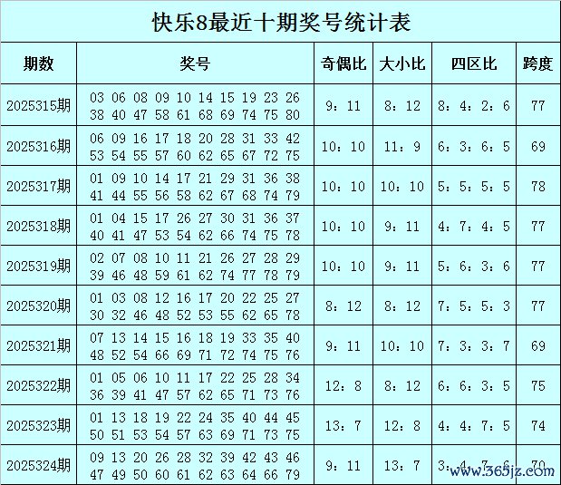 福彩欢快8第2025324期开奖回来:09 13 20 26 28 32 39 42 43 46 47 49 50 60 61 62 63 64 66 79,其中奖号奇偶比开出9:11,大小比开出13:7,四区比开出3:4:7:6,跨度开出70。